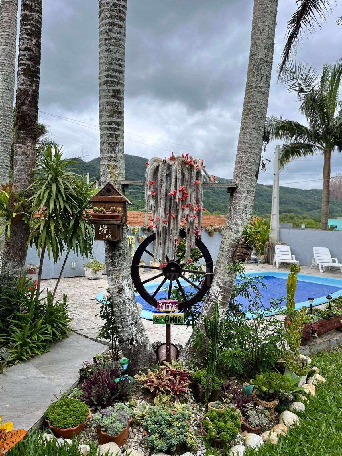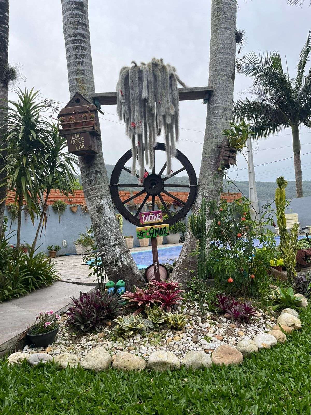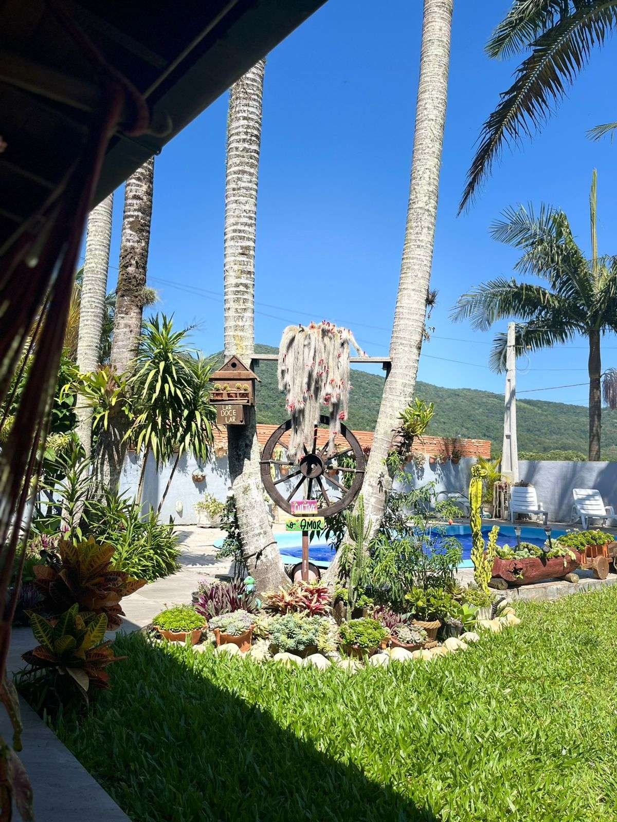O pátio é amplo, com piscina, paisagismo impecável e diversas árvores frutíferas, criando um ambiente de tranquilidade e contato com a natureza.